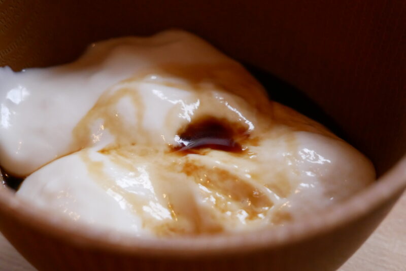落花生が主原料のジーマミー豆腐は、豆類ならではのコクともっちりとした食感が楽しめ、スタッフさんおすすめの黒糖をかけて、スイーツのようにしていただきました。