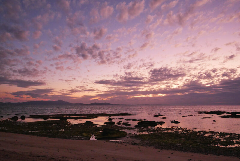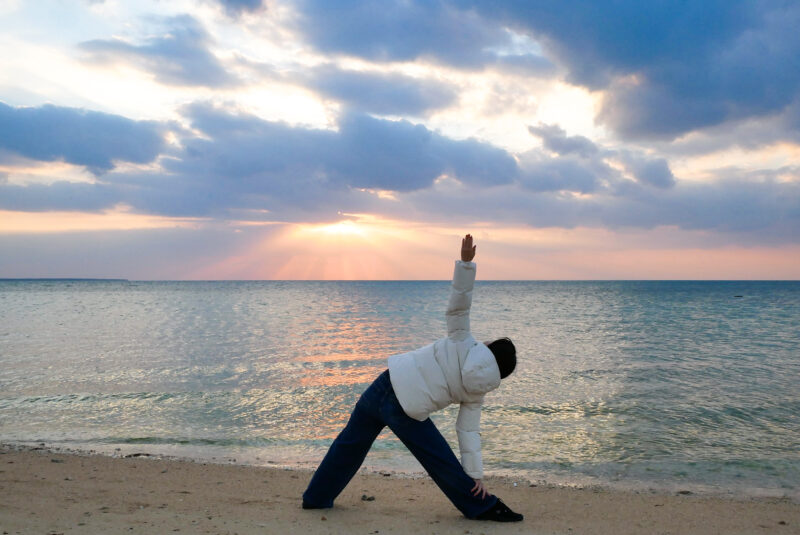 ちなみに、滞在時(1月上旬)は日の出が7:25頃だったので、7:10頃からスタートし、15分ほど体を動かしたら、遠くに見える竹富島のそばから日の出を迎えるという流れでした。
