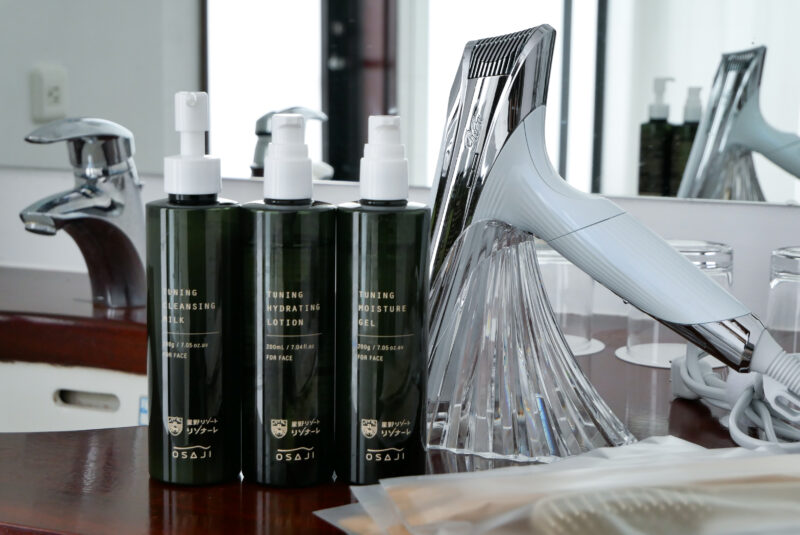 そして、クレンジング・化粧水・保湿ジェル・ハンドソープはOSAJIのもので揃えられており、ウッディなアロマの香りに包まれて心地良い〜。