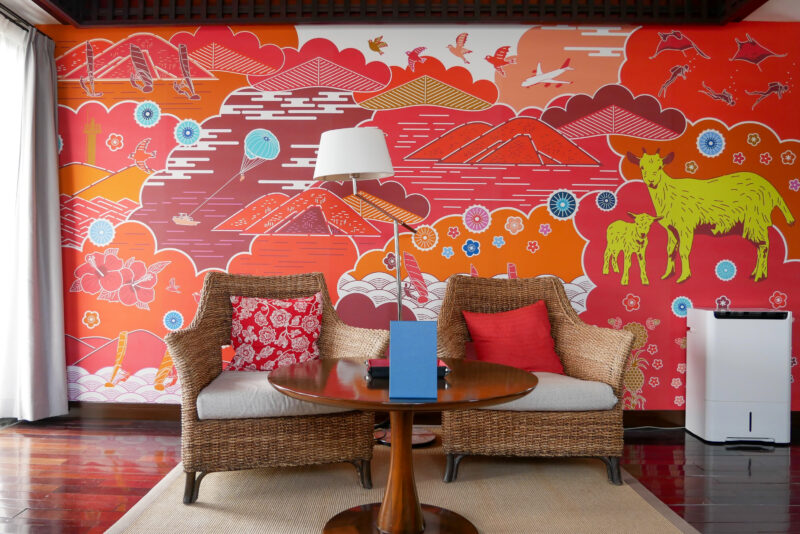 沖縄らしい色・デザインの壁が特徴的な「リビング」。