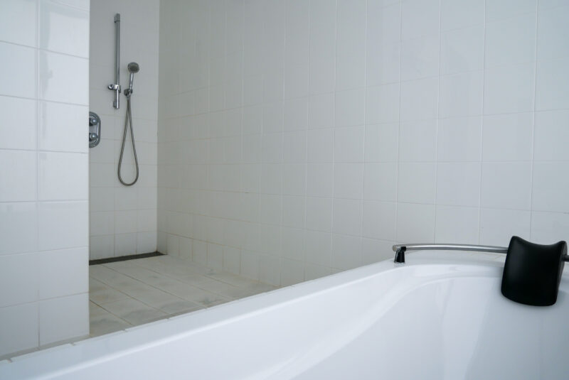 さらにその奥には、足を伸ばしてもあまりあるほど広々とした「バスタブとシャワーブース」がありました。