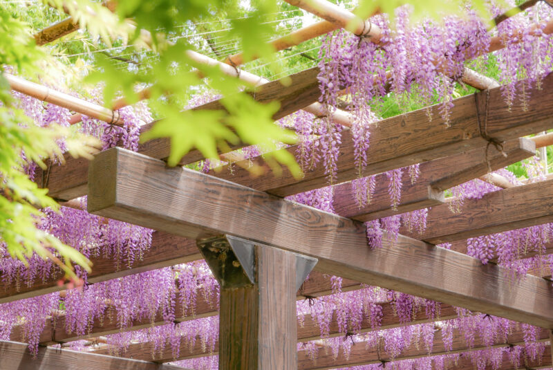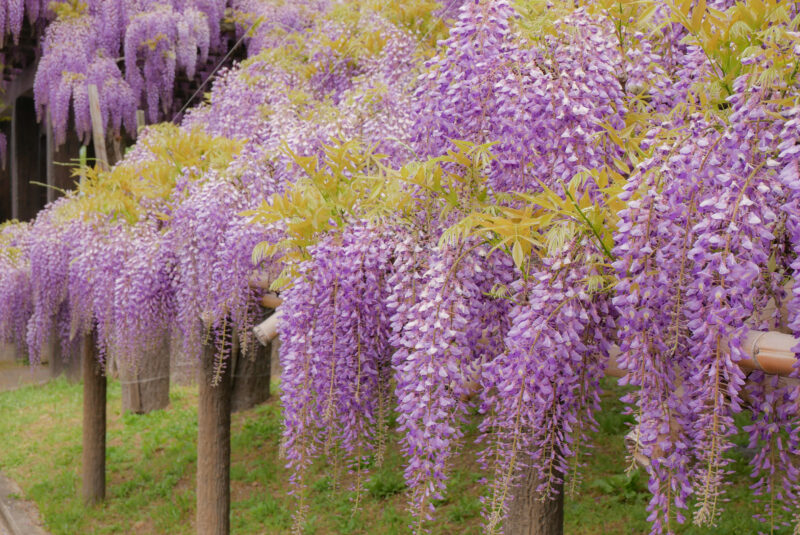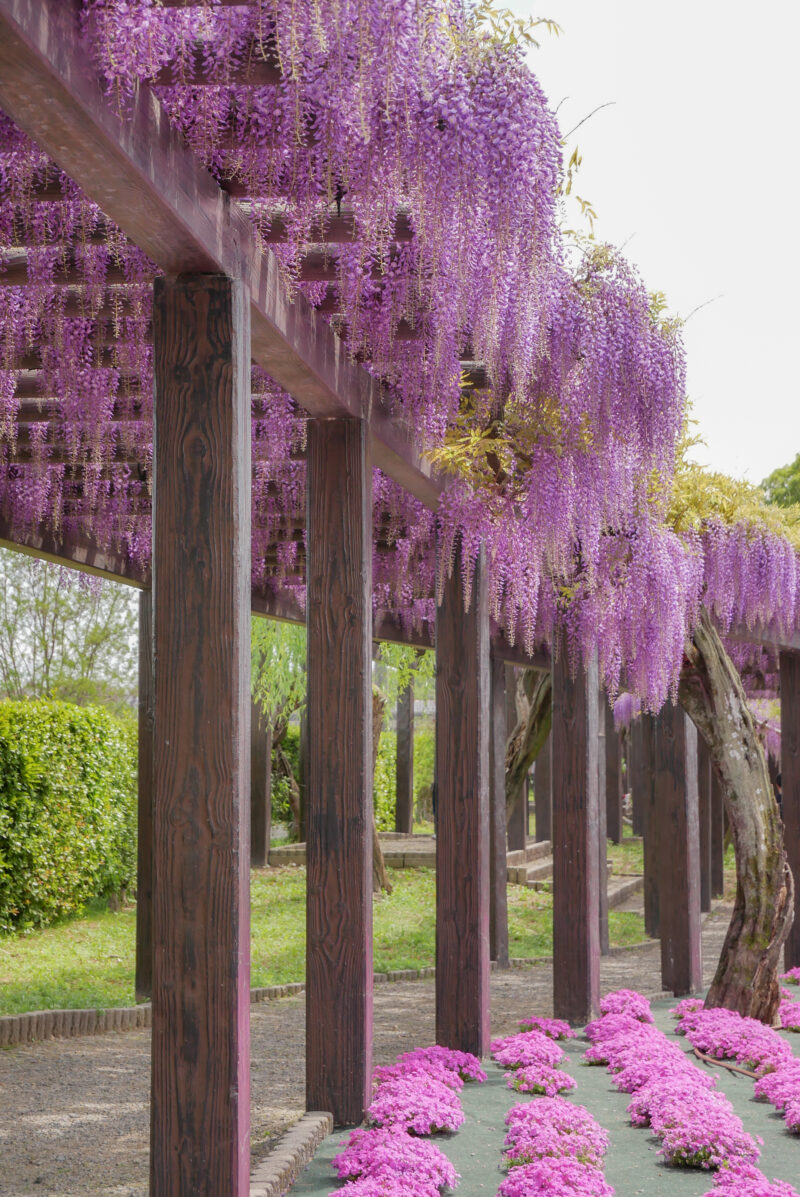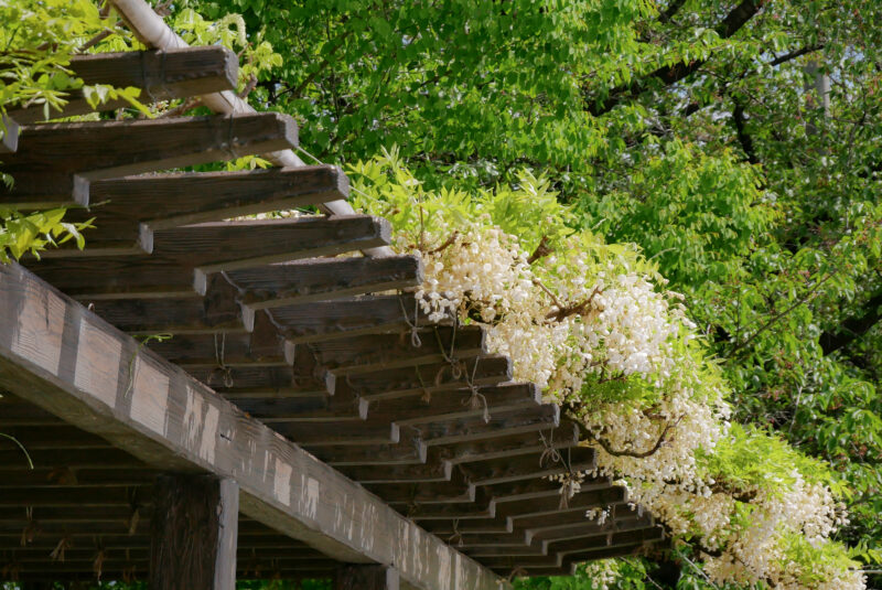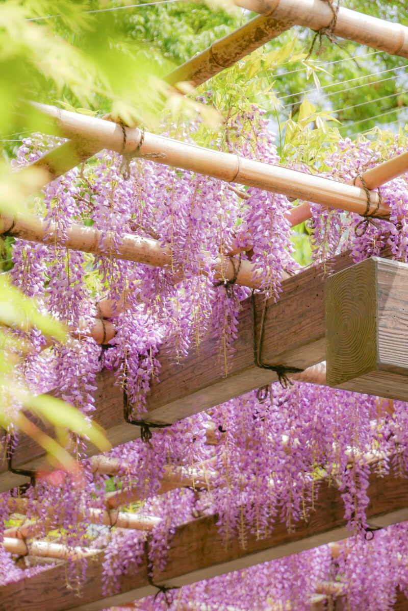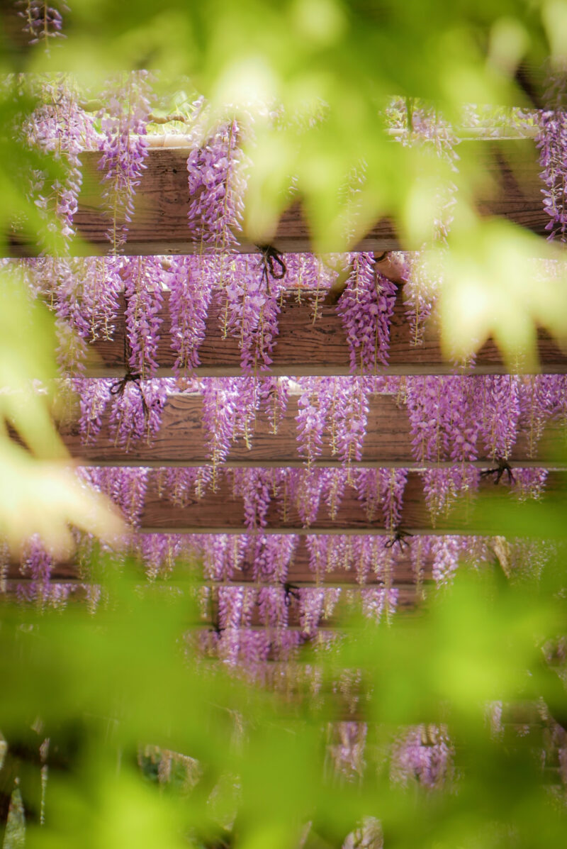 ここの藤の房は決して長くはありませんが、約120m続く藤棚の回廊を楽しむことができます。