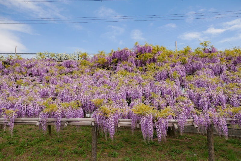 公開エリア内には、ナカフジを中心に、シロバナフジ、シロカピタンの3種類の藤が約40本植えられており、藤棚面積は約1,000㎡とのこと。